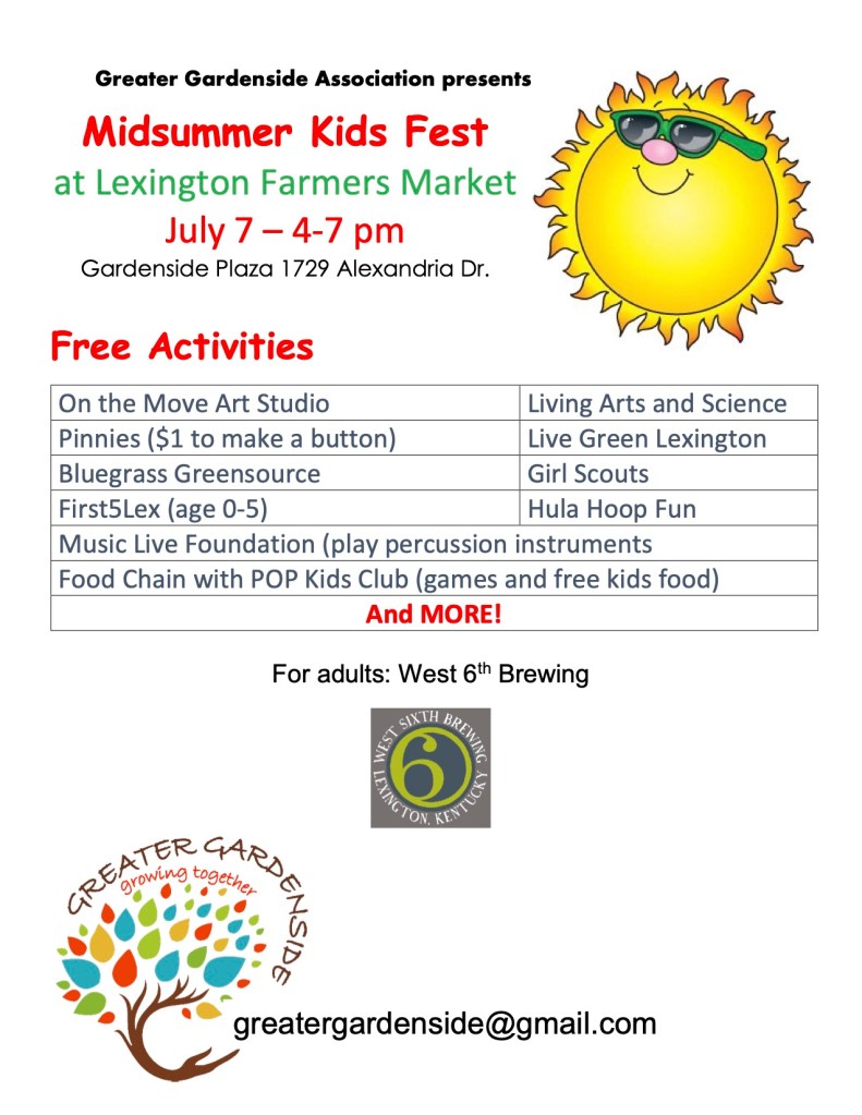 On June 2 from 4-7pm the Lexington Farmers Market will return to Gardenside Plaza (1729 Alexandria Drive) every Wednesday for the whole summer! Plan to shop weekly for fresh produce, artisan cheese, honey, and more.