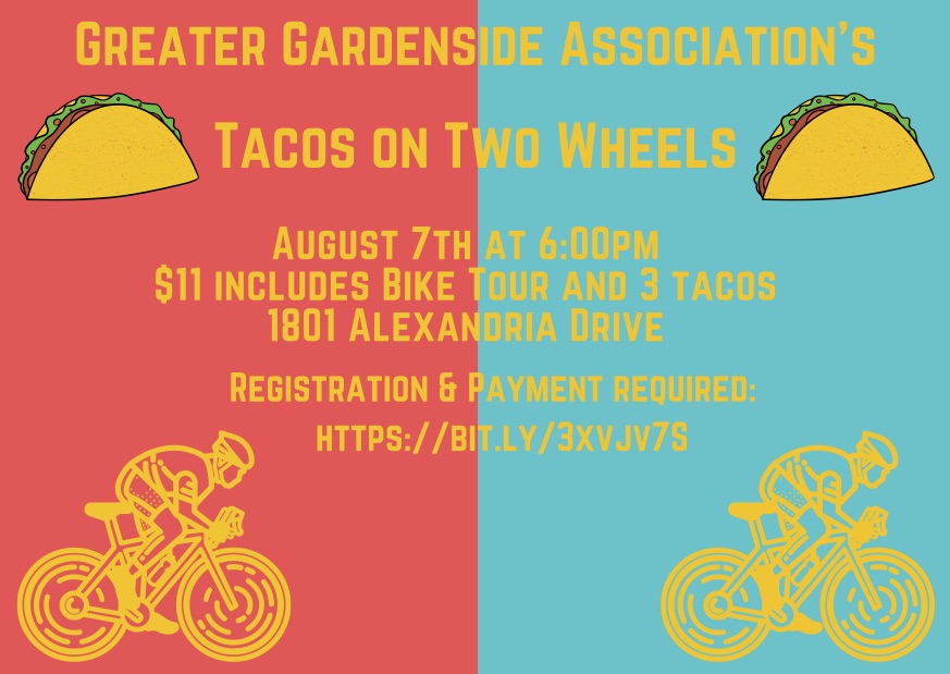 Join the Greater Gardenside Association for a bike tour of the Greater Gardenside area. Afterwards, enjoy 3 tacos from some of our local food trucks.